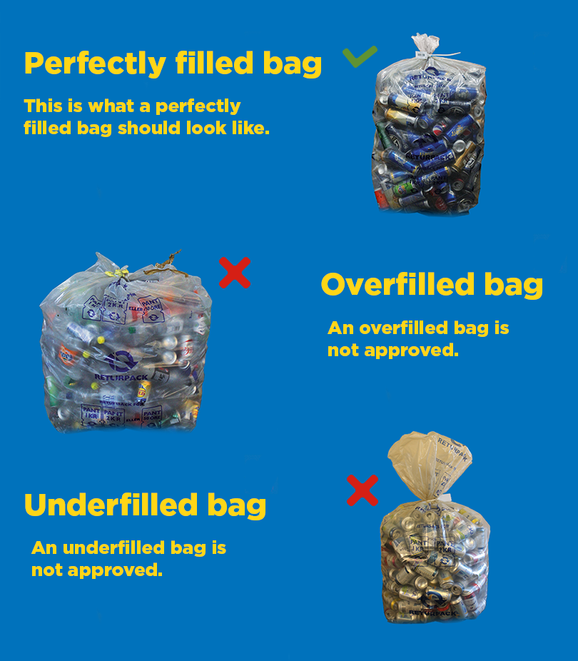 The bag used must be approved by Returpack. The approved bags are specially designed to endure the transport of aluminum cans and PET bottles. Approved bags are available from your beverage supplier.